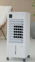 O Climatizador de Ar WAP Clima Control Digital é uma solução 3 em 1 versátil, ideal para climatizar, ventilar e umidificar ambientes, proporcionando maior bem-estar em dias quentes. Com 100W de potência e um reservatório generoso de 8,5 litros (dividido entre compartimento superior e inferior), o aparelho garante autonomia e eficiência. Possui painel digital touch, display LED e controlo remoto para total conveniência. O sistema de oscilação vertical automática e as aletas horizontais reguláveis permitem uma distribuição uniforme do ar, enquanto os dois blocos de gelo incluídos potencializam a sensação de frescura.